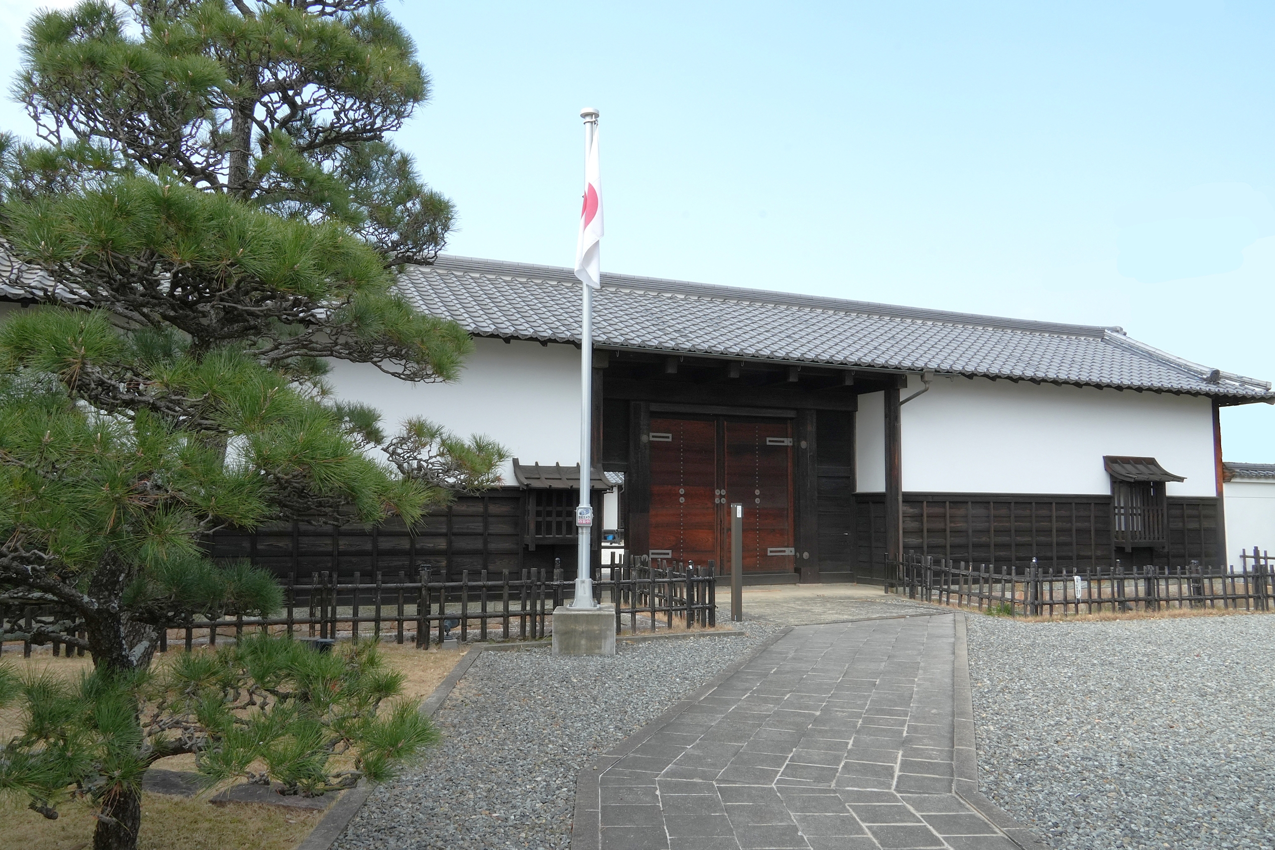 主屋から大門を見る 中央:大門 右:管理棟