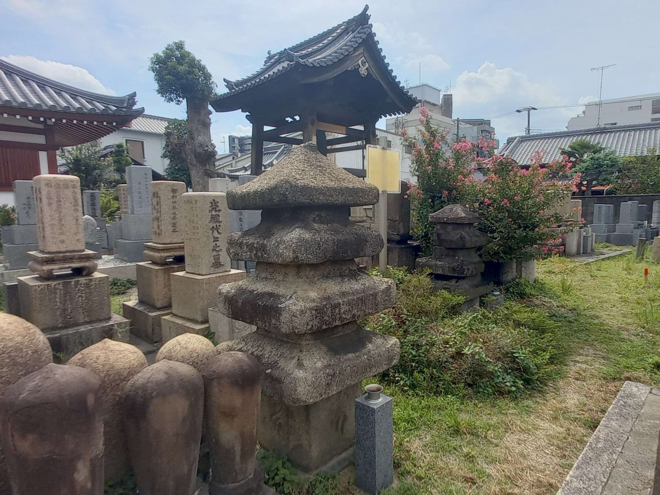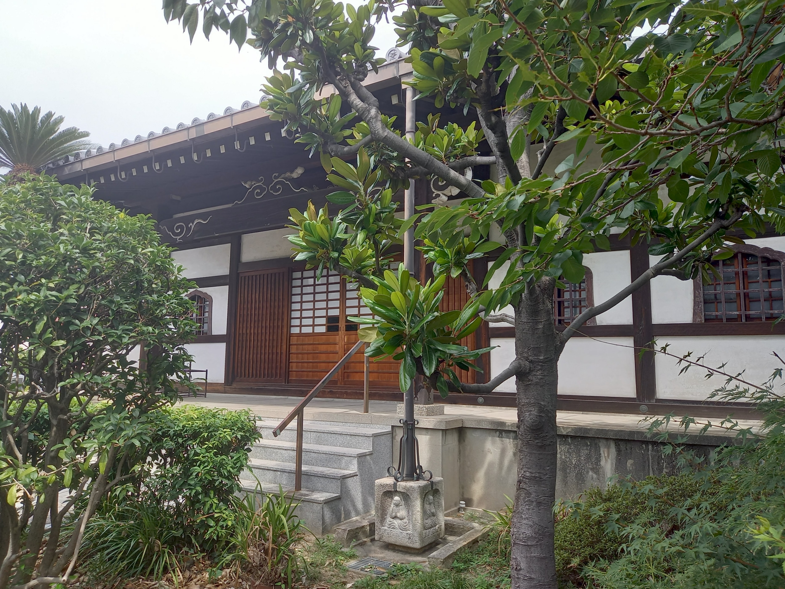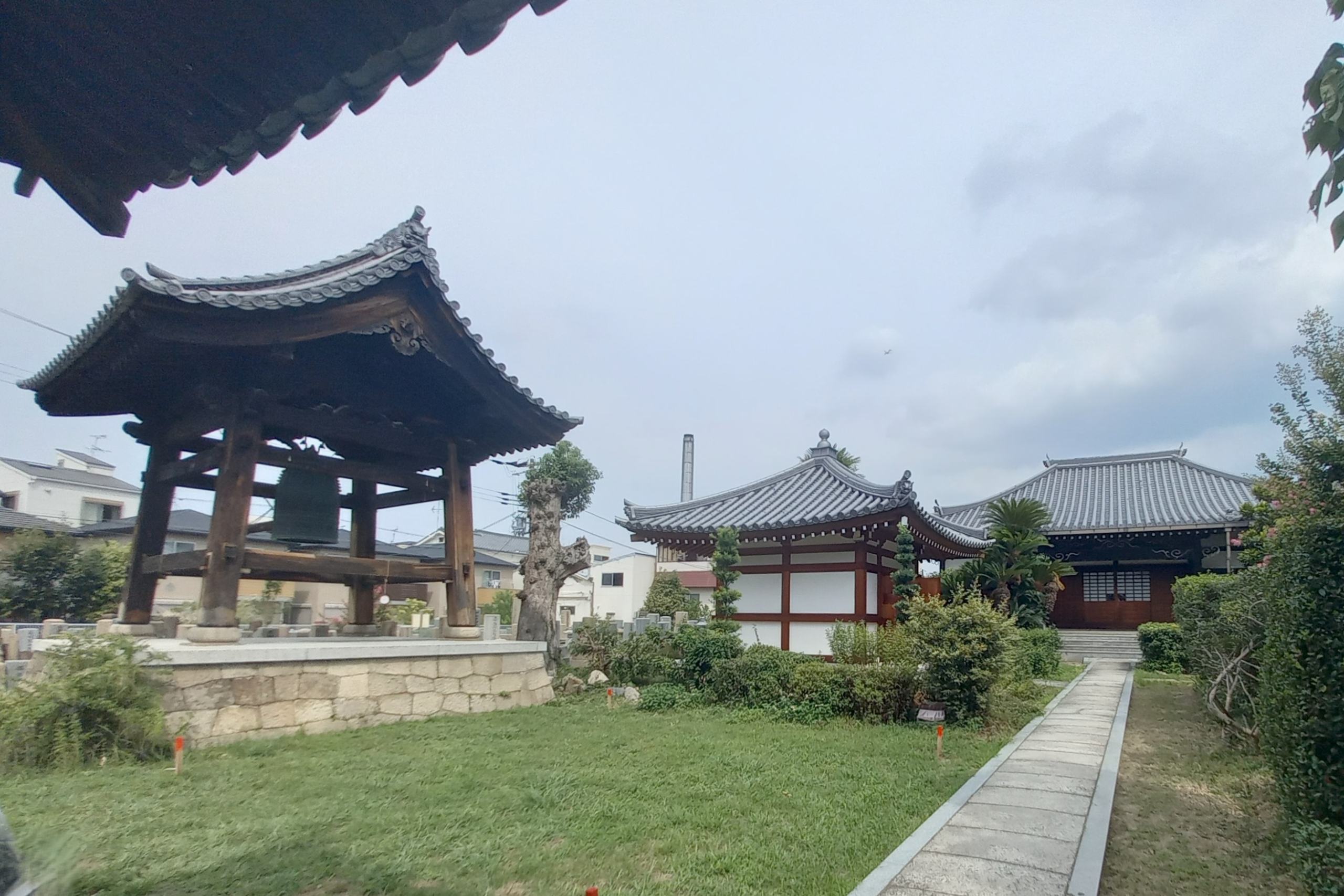 名称 法明寺/ほうみょうじ 所在地 大阪市東成区深江南3-16-28 TEL/FAX HP E-mail 建築年代 本堂:元禄7年(1694) 建物種別 宗教 構造 本堂:木造平屋建寄棟造本瓦葺 概要説明 文保2年(1318)に融通念佛宗を修めた法明房良尊により創建と伝わる。慶安元年(1648)浄土宗の僧善誉夢白が再建し浄土宗に転じ、元明元年(1781)可円和上を律開祖とし浄土律寺に改格される。元禄7年(1694)建築の本堂は寄棟造本瓦葺に改修。南面し、間口5間で中央間を広く取り向拝を付ける。内陣は太い円柱を用い、平面形が凸型で1段高く造られており、僧侶修行を目的とした律の寺の特徴を示す。諸堂は明治18年(1885)の洪水で大きな被害を受けるが、大正元年(1912)の大修繕や戦後の改修を経て、江戸時代の形態が継承される。本堂・薬医門・庫裏・鐘楼の4棟が国登録有形文化財。