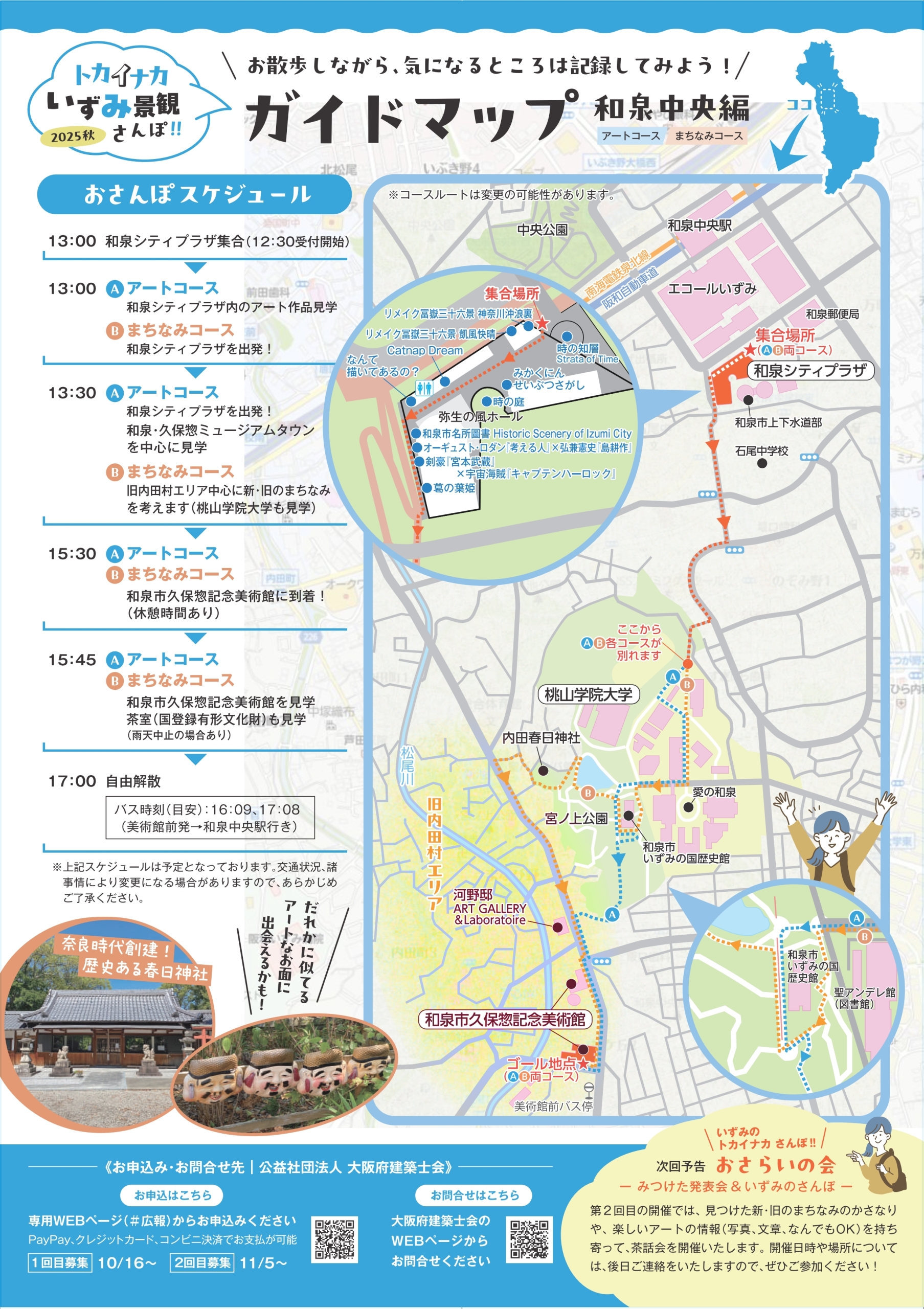 和泉市とその周辺にお住いの方向けに、和泉市の景観を考える機会を提供し、景観意識の醸成を図る目的でまちあるきイベントを開催します。現代アートも堪能する「アートコース」(講師:後藤健一郎氏・和泉市久保惣記念美術館学芸員)と、新旧の風景を再発見する「まちなみコース」(講師:陸奥賢氏・コモンズデザイナー)を準備しています。