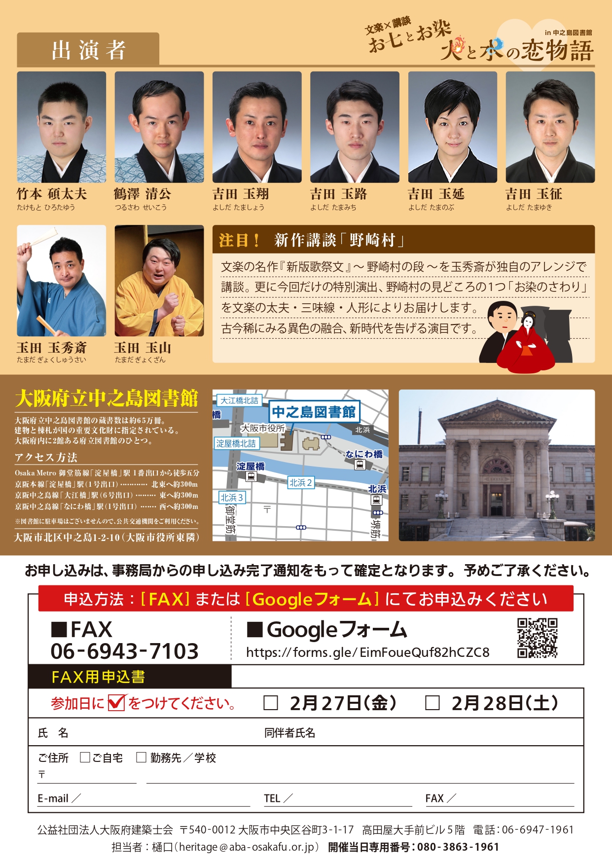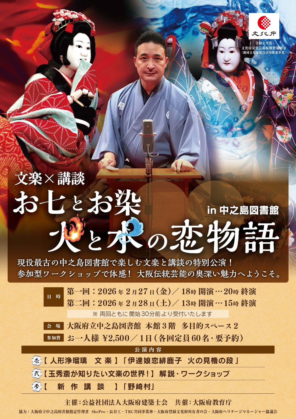 現役最古の中之島図書館で楽しむ文楽と講談の特別公演! 参加型ワークショップで体感! 大阪伝統芸能の奥深い魅力へようこそ。 ▼公演内容 壱【 人形浄瑠璃 文 楽 】 「伊達娘恋緋鹿子 火の見櫓の段」 弐【玉秀斎が知りたい文楽の世界!】解説・ワークショップ 参【 新 作 講 談 】 「野崎村」 ▼日程 第一回:2025年2月27日(金)/18時開演…20時閉演 第二回:2025年2月28日(土)/13時開演…15時閉演 ※両回ともに開始30分前より受付いたします。 ▼会場 大阪府立中之島図書館 本館3階 多目的スペース2 (大阪市北区中之島1-2-10) ※駐車場はございませんので、公共交通機関をご利用ください。 ▼参加費 お一人様 2,500円/1日 ▼定員 60名 ▼主催:公益社団法人大阪府建築士会 共催:大阪府教育庁 ▼お申込み・詳細はこちらへ