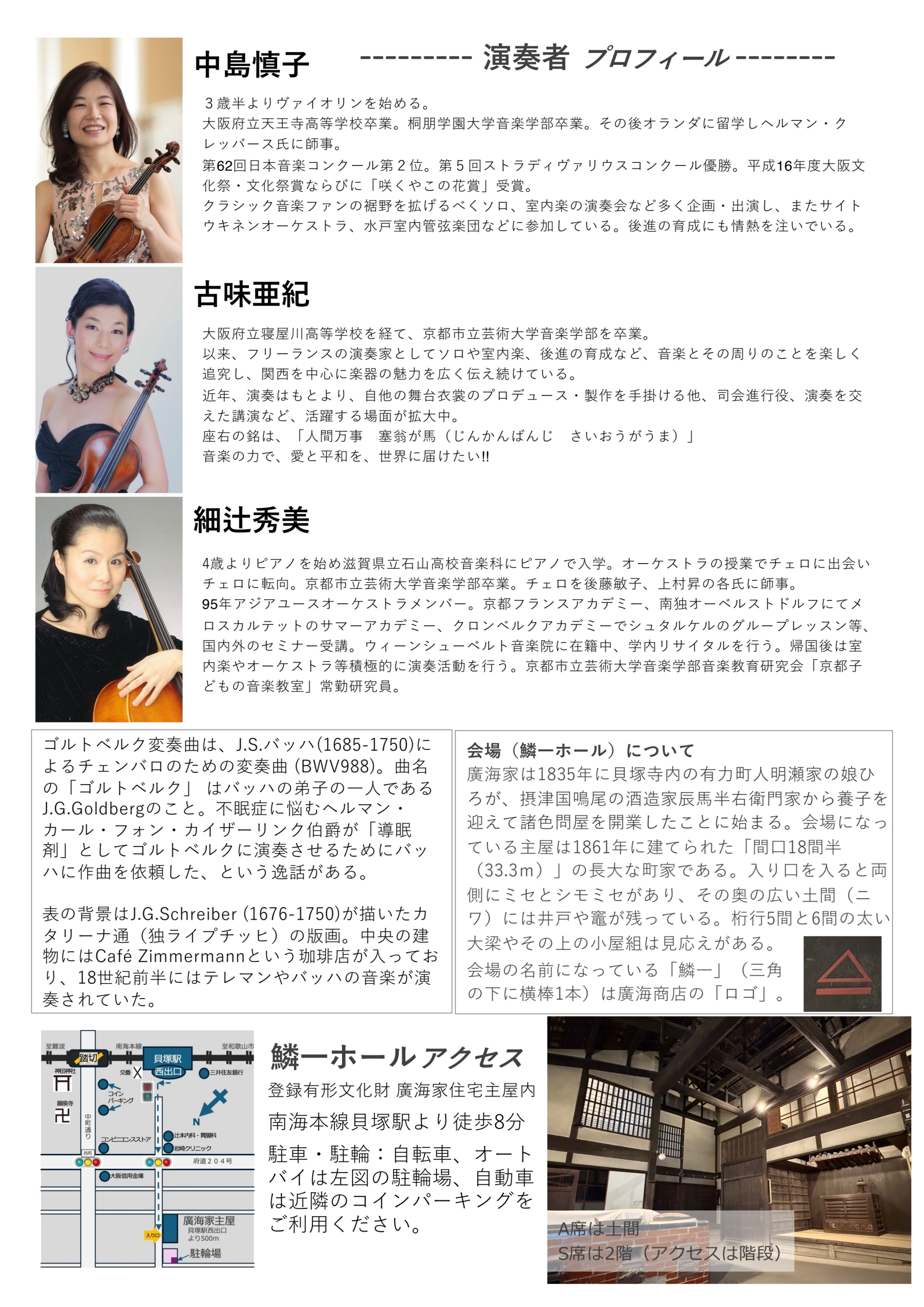 日時:2026年3月29日(日) 13:30開場 14:00開演 会場:鱗一ホール 登録有形文化財 廣海家住宅主屋内 南海本線貝塚駅 ⻄出口より徒歩8分 出演:中島慎子(ヴァイオリン)、古味亜紀(ヴィオラ)、細辻秀美(チェロ) 曲目:J.S.バッハ ゴルトベルク変奏曲(D・シトコヴェツキー編曲) 料金(飲み物・お菓子付き):A席 [土間] 4,000円、S席 [2階] 5,000円 ご予約はこちら お問合せ:urokoichi163@gmail.com 主催:鱗一ホール 共催:一般社団法人貝塚寺内町保存活用事業団