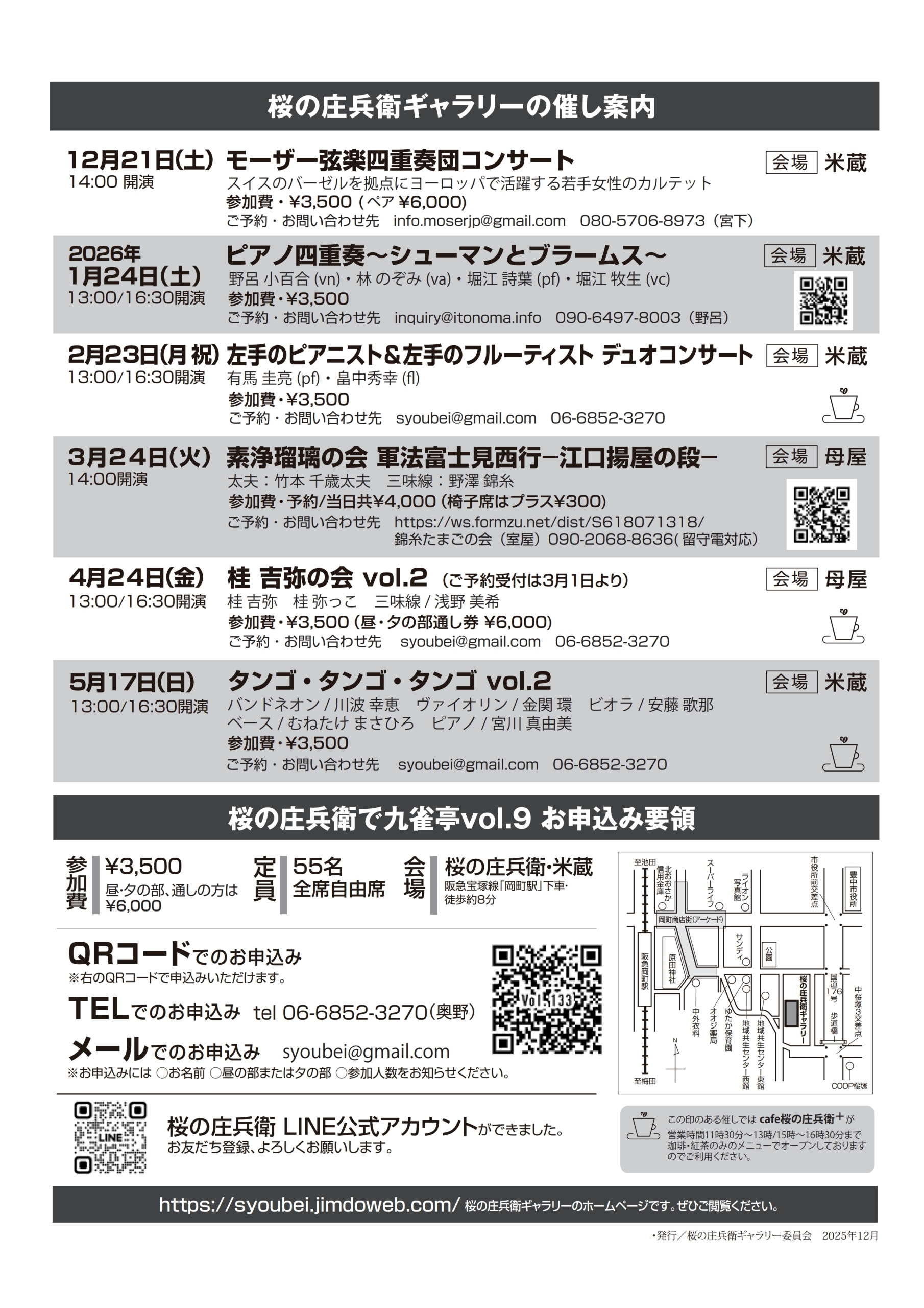 ★2026年1月25日(日) 昼の部13:00開演(12:30開場)55名様 夕の部16:30開演(16:00開場)55名様 ★参加費 3,500円 昼の部・夕の部通しの方は6,000円 ★出演 出演:桂 九雀・桂 九ノ一・桂 久寿玉・お囃子 岡野鏡 ★会場 桜の庄兵衛「米蔵」 ★お申し込み方法 お申込みフォームまたはメールまたはお電話でお申込み下さい ◆お申し込みフォームはこちらから ◆E-mail:syoubei@tcct.zaq.ne.jp ◆電話:06-6852-3270